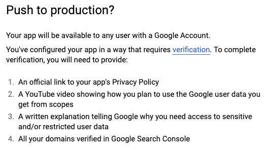 Given that the number of test users is limited to 100, this may be a requirement soon. More info here. The info however on that site is at odds with the verification requirement, as this mentions unverified apps are ones that requests ‘sensitive or restricted OAuth scopes’.. which we aren’t. Also, it says verification is not required for OAuth-based plugins, which is what we are using [ the Google plugin in Bubble]. Anyone with definitive answers on this topic please let me know in the comments.