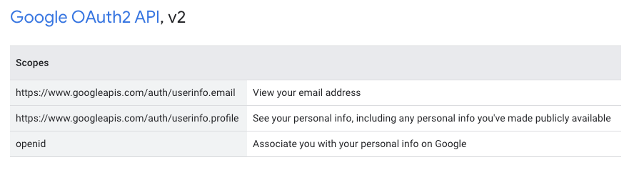 Which scopes to choose can be complicated, as there are hundreds. If you go to this page https://developers.google.com/identity/protocols/oauth2/scopes#oauth2 and choose Google OAuth2 API, V2 from the right side menu, you see this guide